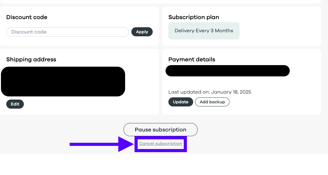 Step 3. If pausing or rescheduling is not the best fit for you. Please scroll down and look for the option "Cancel Subscription"