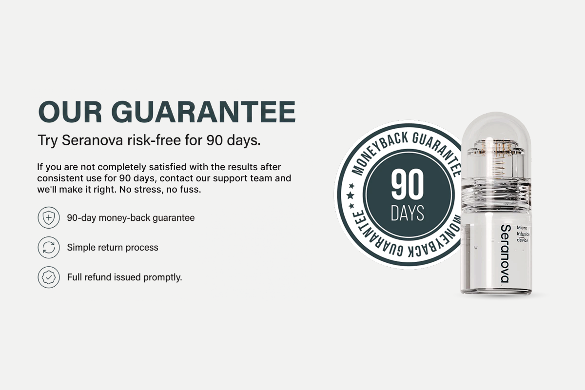 The guarantee applies to all first-time purchases made directly on seranovabeauty.com, including the Micro-Infusion System, Collagen Cream, Patches, and Masks.