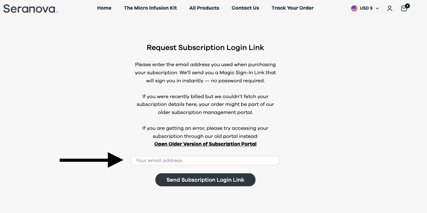 Step 3. Enter the email associated with your Seranova Purchase, and a 1 time login link will be sent to your email address, follow the instructions in that email. Please make sure to check on your Spam folder!