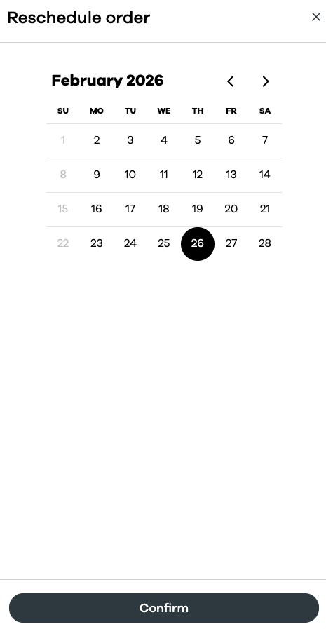 Step 4: Reschedule your order; Click on "Reschedule" and select the date that better fits your needs, then click "Confirm"