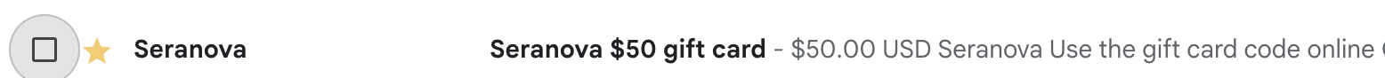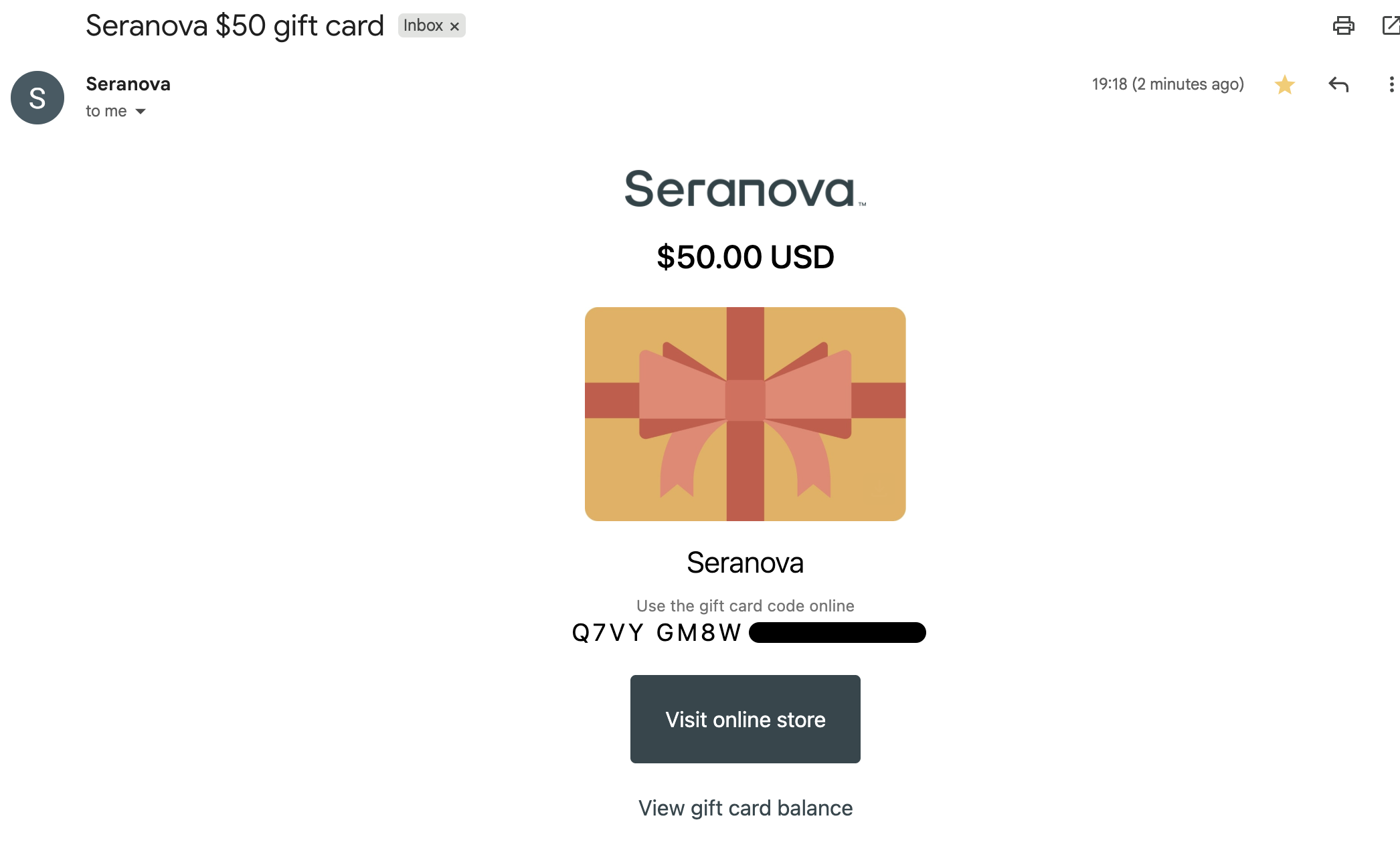 1. Each gift card is sent to the email address associated with your Seranova purchase. Simply look in your inbox for an email from Seranova.