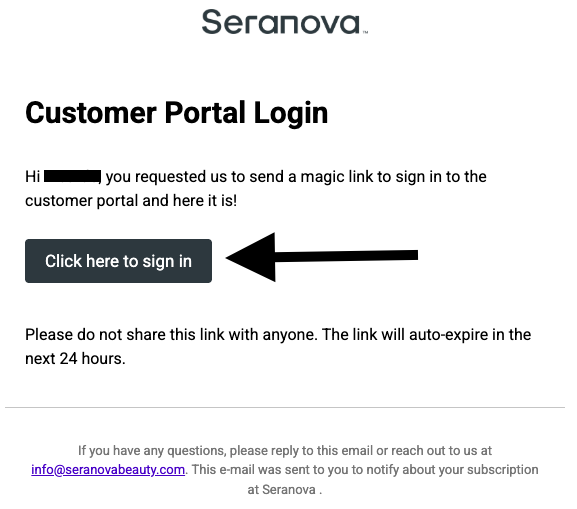 Step 3. Enter the email associated with your Seranova Purchase, and a 1 time login link will be sent to your email address. Please make sure to check on your Spam folder!